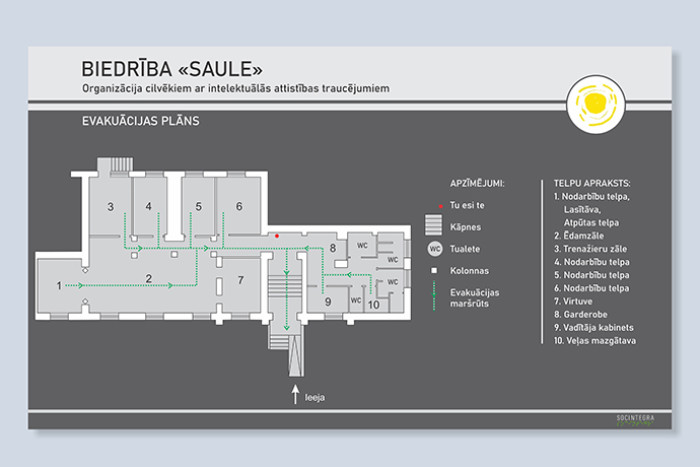 Evakuācijas plāni - praktiski un droši risinājumi ar telpas reljefa plānu, kabinetu apzīmējumiem un evakuācijas ceļiem. Visa informācija tiek dublēta Braila rakstā, nodrošinot pieejamību ikvienam.